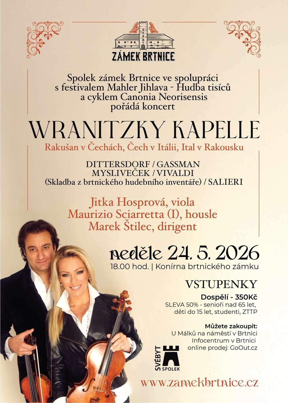 plné vstupné 350 Kč | snížené 175 Kč | vstupenky k prodeji u Málků na náměstí a v Infocentru Brtnice, online na GoOut.net